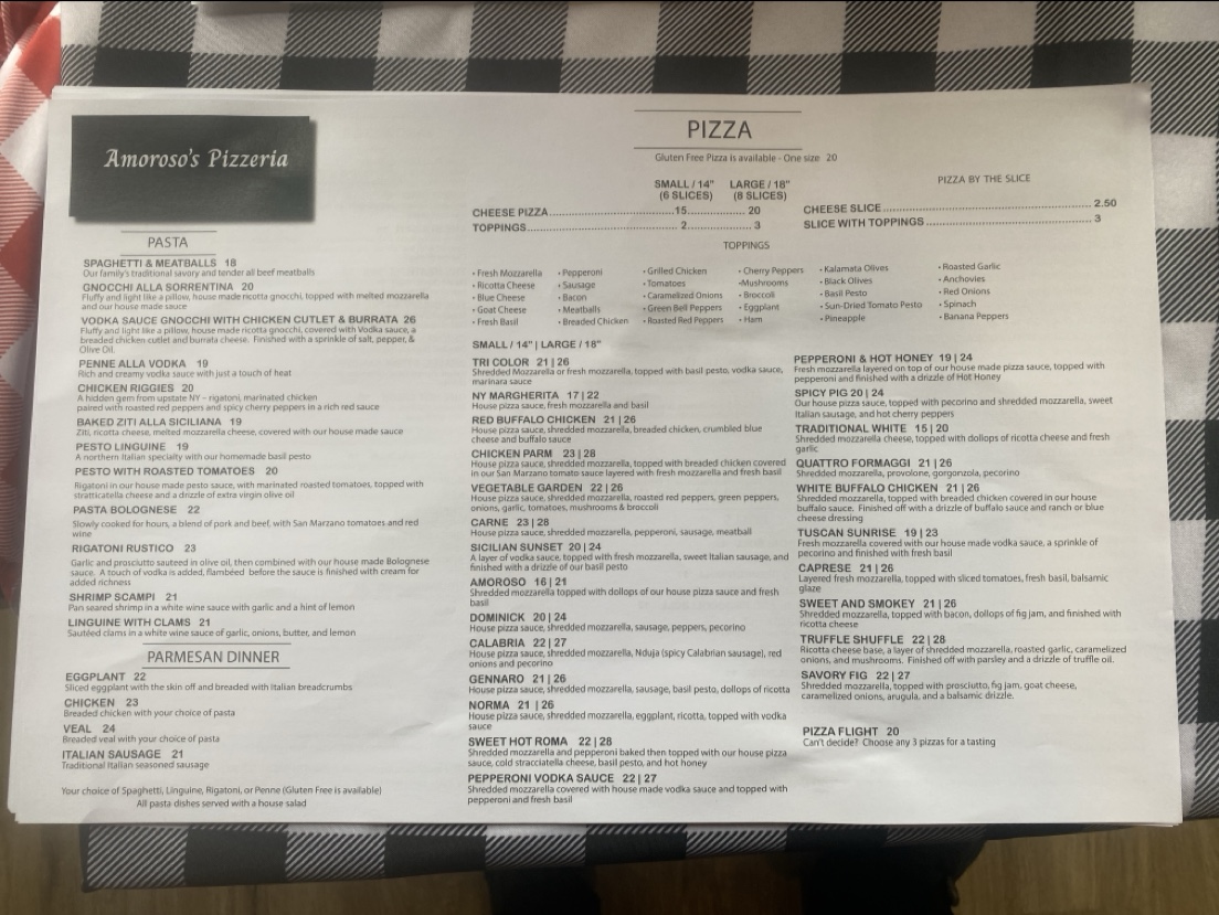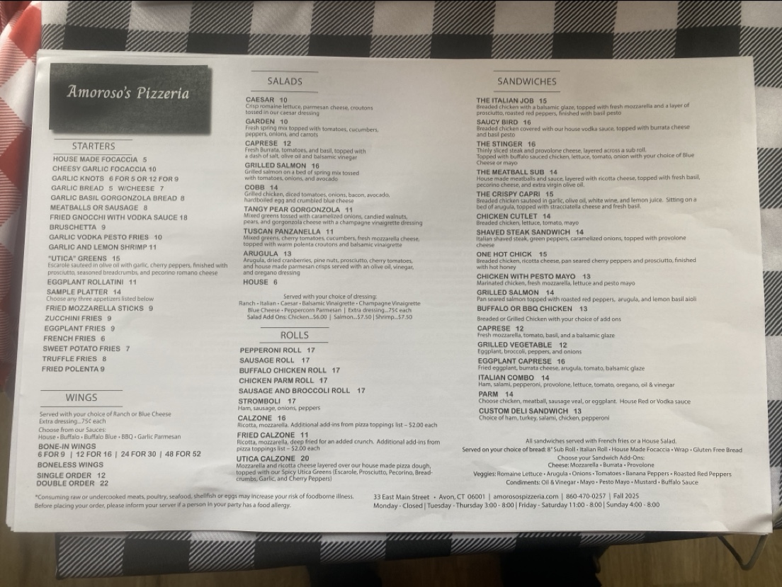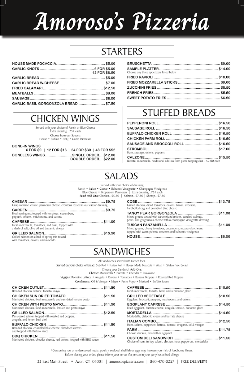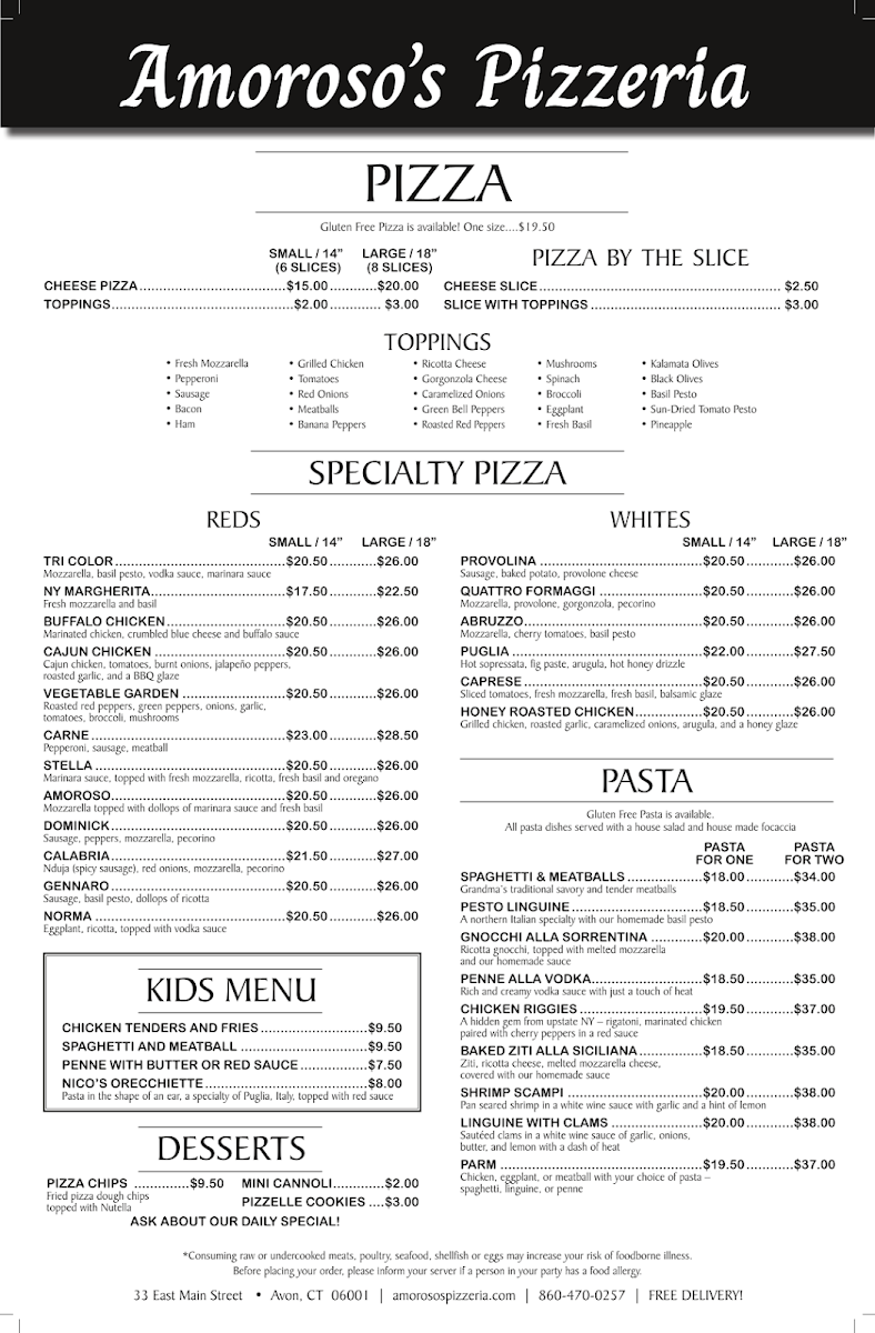 When you're craving a delicious slice of pizza, the Amoroso's Pizzeria Menu has something to satisfy every taste. Located at 33 US-44 in Avon, CT, this charming pizzeria offers an inviting atmosphere where you can indulge in freshly baked pizzas made with the finest ingredients. Whether you're in the mood for a classic Margherita, a hearty meat-lovers delight, or a specialty pie with bold, unique toppings, you'll find plenty to choose from. The menu is designed to cater to all, with options ranging from delicious pastas to crispy salads and mouthwatering sides that are perfect for sharing. Each dish is crafted with care and attention to detail, ensuring a memorable meal every time. So, grab a seat and explore the variety of flavors that make Amoroso's Pizzeria a local favorite!