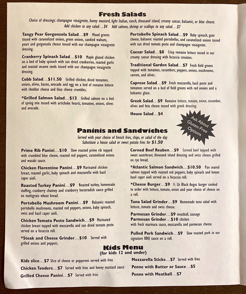 Arugula, topped with fresh mozzarella, pine nuts, dried cranberries, cherry tomatoes, prosciutto and Parmesan crisps. Finished with a house dressing of olive oil, balsamic vinegar, and oregano.